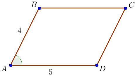Пусть стороны параллелограмма \(\displaystyle AB=4\) и \(\displaystyle AD=5 \small,\) \(\displaystyle \angle BAD\) – острый угол параллелограмма.